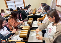 | 4月11日京都にて、ひまわり・AAO合同バス旅行『生八つ橋作り/伏見稲荷大社散策』を開催しました。生八つ橋作り体験では、スタッフの方の丁寧な説明を聞きながら、生地作りから餡を入れて包み、一から自分で八つ橋を作り上げるという貴重な体験をさせていただきました。参加者同士で和気あいあいと楽しく体験ができ、自分で作った八つ橋はより一層美味しく感じられました。 |